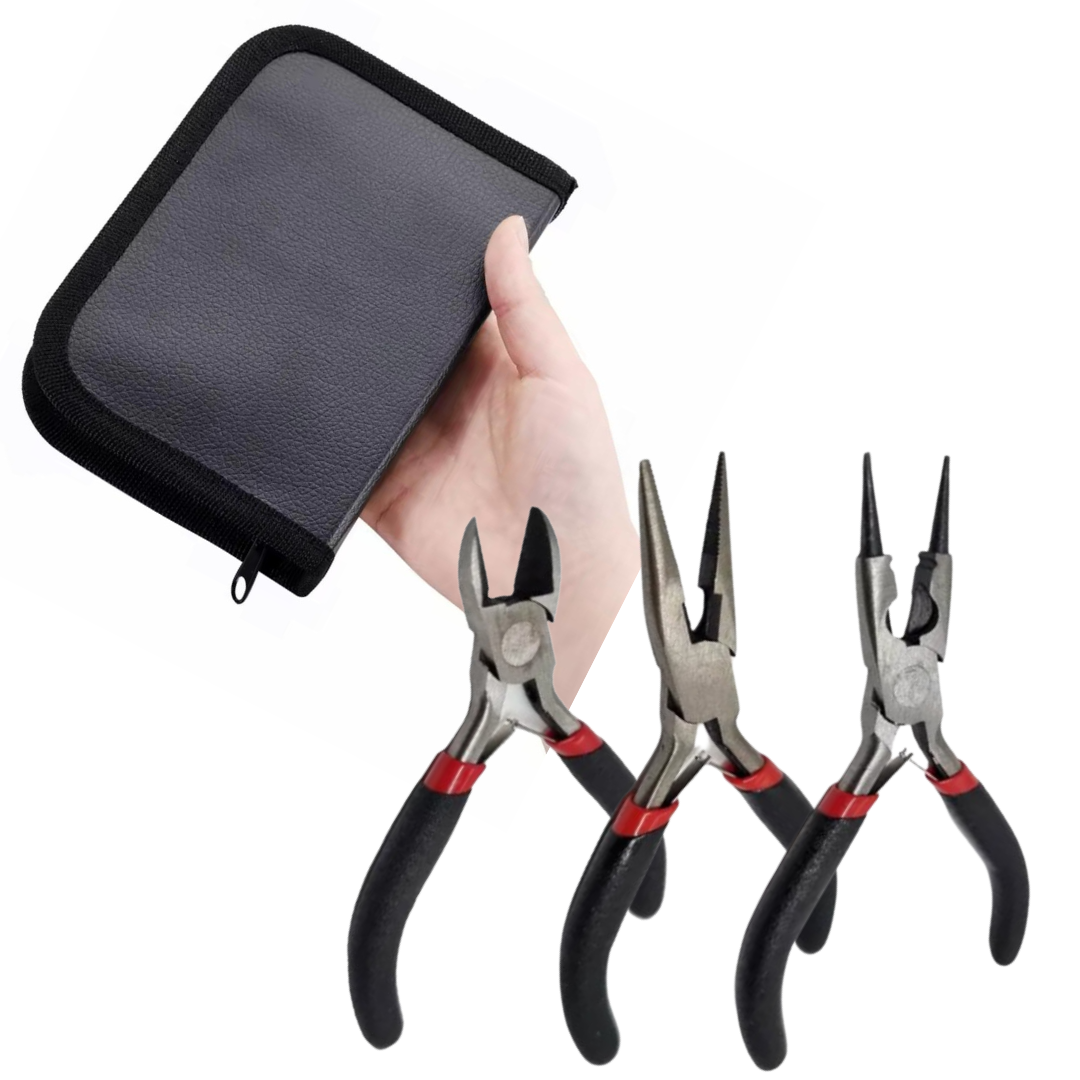 Incluye tres pinzas, corte, aplanar, doblar y su estuche con cremallera para guardar.